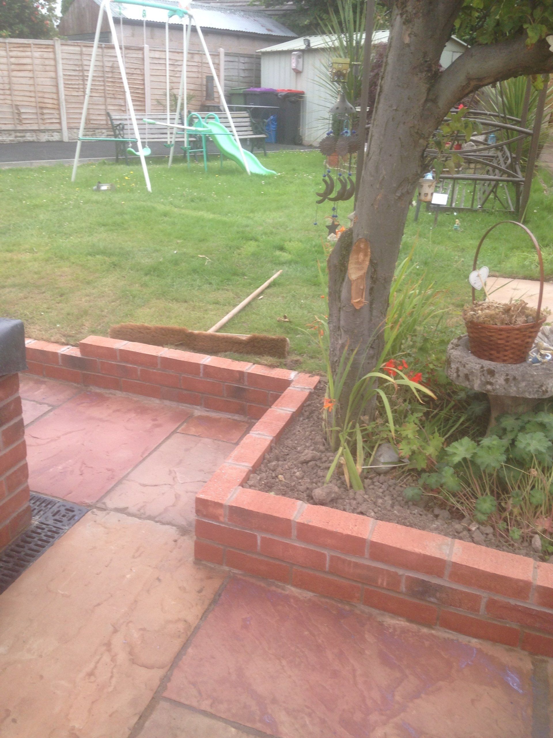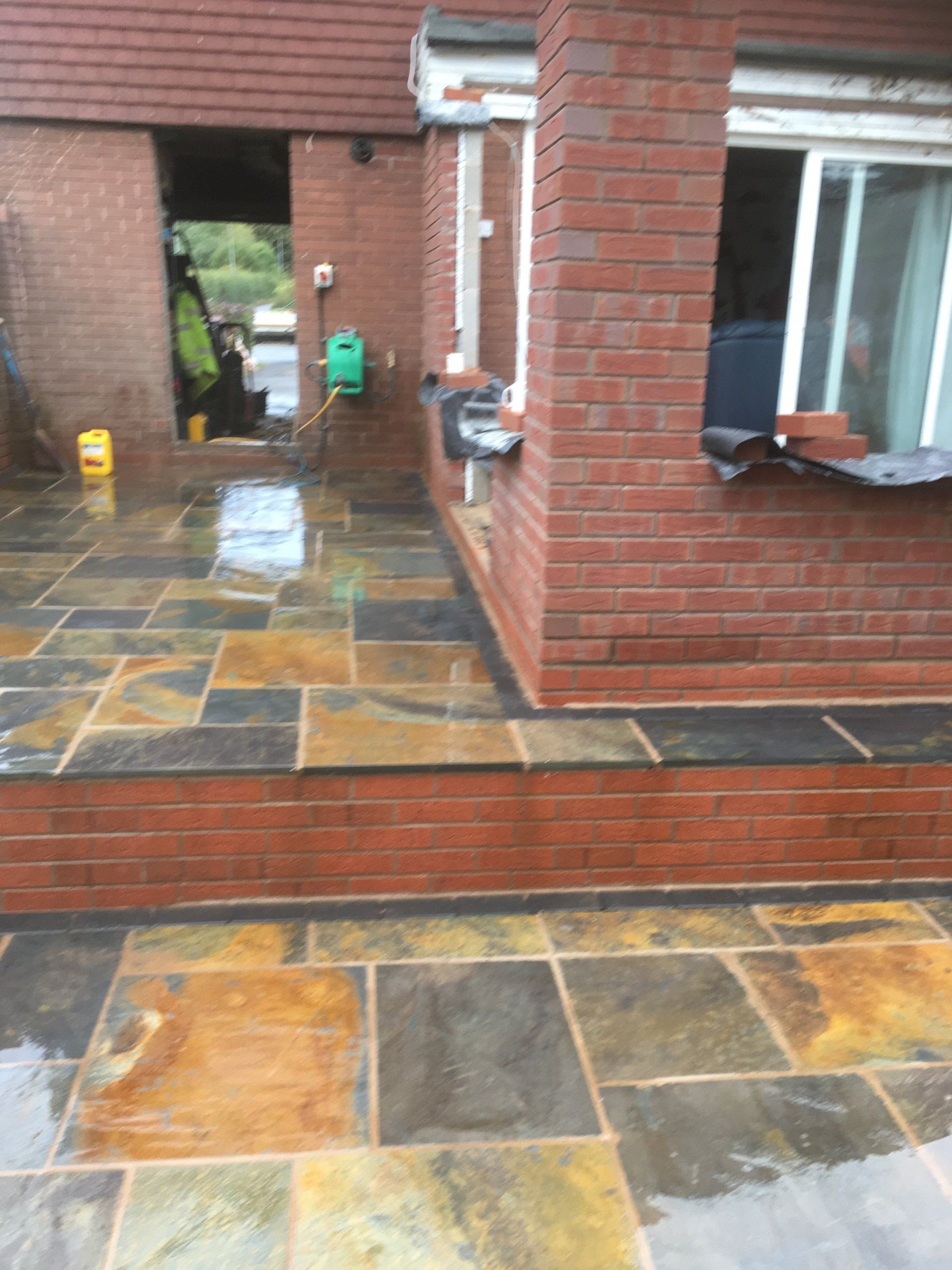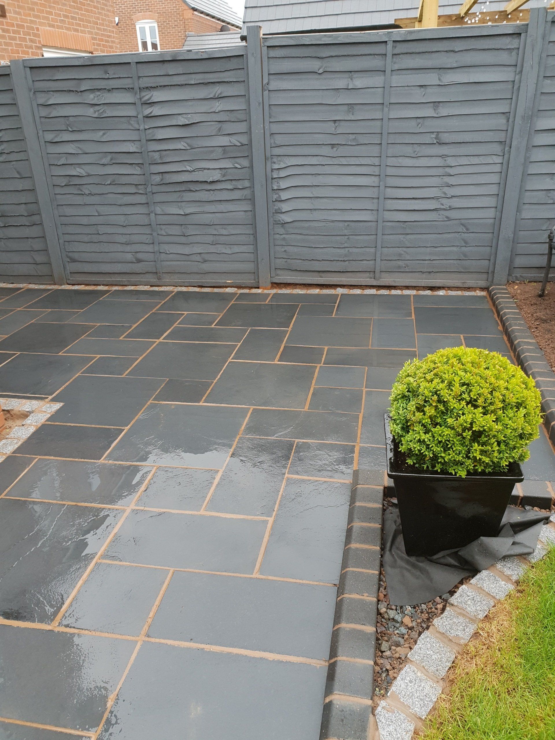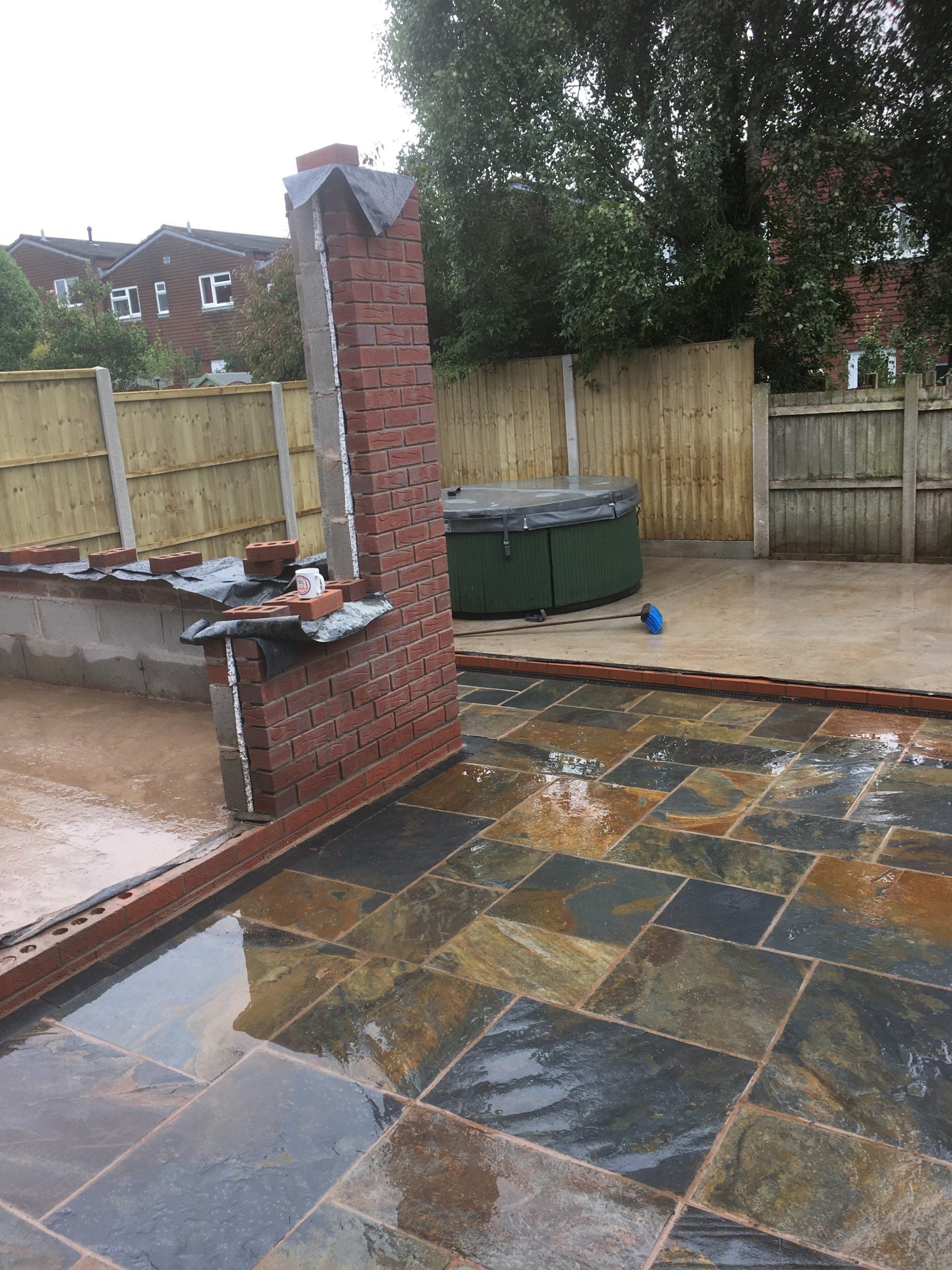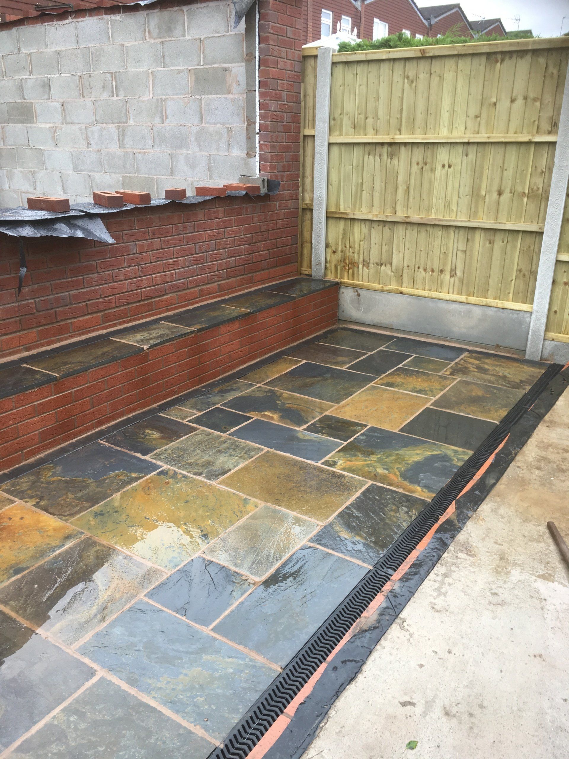 Warm roof conservatory project with slate patio and granite stone circular feature